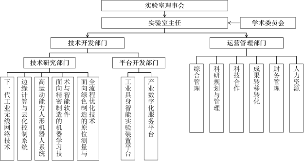 实验室围绕科研创新和支撑服务保障两条主线,设立技术开发部门和运行管理部门。围绕实验室五大研究方向和两大平台,设立技术研究部和平台开发部,同时将与省内重点企业建设一批企业联合实验室。针对实验室在资源聚集、人才汇聚、知识产权和成果转化方面的特殊定位,设置专门管理支撑机构。